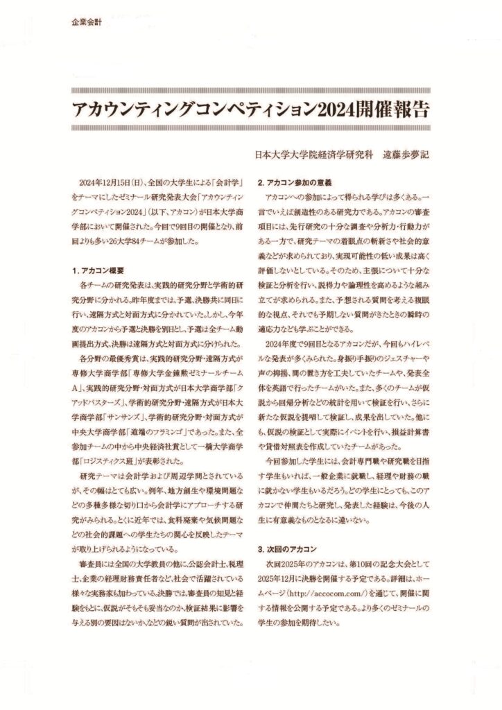 2025年2月発売の『企業会計』2025年3月号の61ページにアカウンティングコンペティション第9回(2024年)の記事広告を掲載しました。